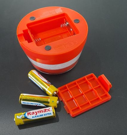 Es wurden Batterien statt Akkus verwendet. Dies hat den Vorteil, dass bei nur gelegentlichem Gebrauch die Akkupflege entfällt und Akku-Rohstoffe eingespart werden. Die kleinen, runden Magnete ermöglichen auch eine senkrechte oder schräge Anbringung an ferromagnetische Metalle. Im Auslieferungszustand befindet sich ein Isolationsstreifen im Batteriefach, der ein ungeplantes Einschalten verhindert. Dieser Isolationsstreifen kann auch eine Batterieentladung im Stand-By-Betrieb, d.h. wenn die Leuchte über die Schalter an der Leuchtenoberseite ausgeschaltet wurde, verhindert und sollte bei Lagerung im Fahrzeug, Transport in der Tasche eingesetzt werden, damit die Funktion sichergestellt ist.